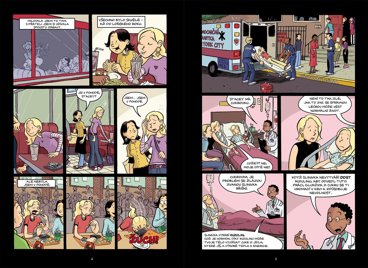 Druhý díl nové komiksové série od Rainy Telgemeierové, autorky bestsellerů Duchové, Úsměv, Drama, Nervy a Ségry, je tady a přináší další z příběhů Kristy a jejího klubu Ann M. Martinové, jednoho z nejpopulárnějších komiksů své doby (celosvětově se vytisklo více než 176 miliónů knih), podle kterého vznikl i neméně známý stejnojmenný seriál. Dvanáctiletá Stacey žila v New Yorku, měla spoustu přátel a nic jí nechybělo. Milovala rušný život ve velkoměstě. Potom ale onemocněla cukrovkou. Těžko se se svou nemocí vyrovnávala, navíc přišla o všechny kamarády. Proto jí ani nevadilo, když se s rodiči přestěhovala do městečka Stoneybrook. Tady poznala Kristy, Mary Anne a Claudii, s nimiž se spřátelila a společně založily klub na hlídání dětí. Teď se ale objevila konkurenční agentura s nekalými praktikami. Rodiče navíc Stacey domlouvají schůzky u dalších a dalších lékařů a ona je musí přesvědčit, že je samostatná a zodpovědná dívka a se svou nemocí si dokáže poradit.